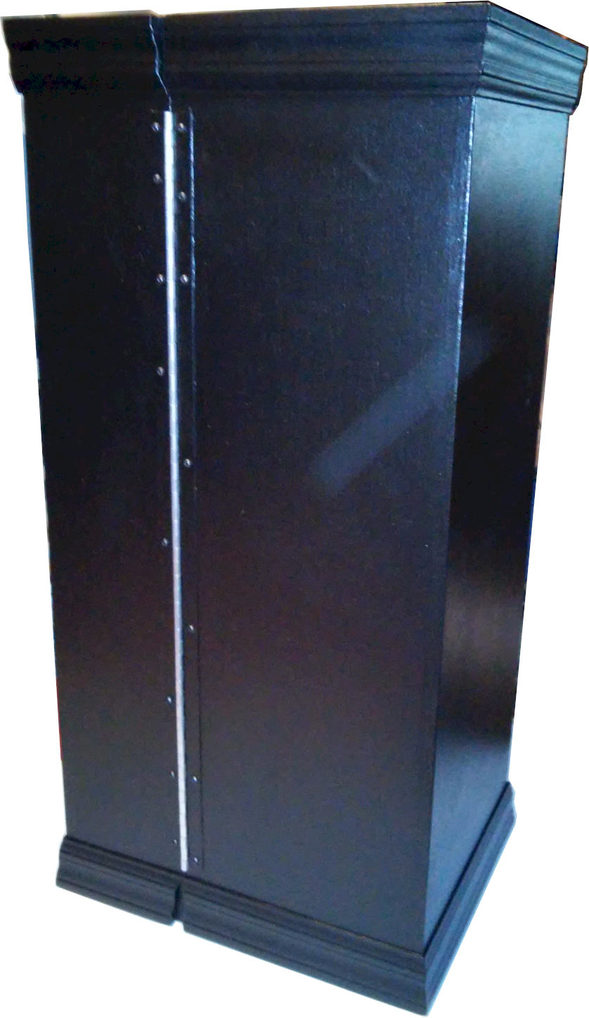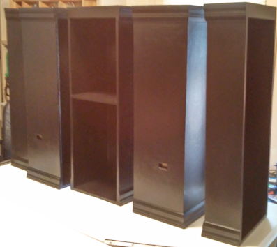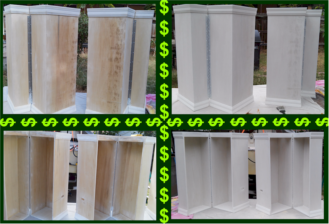 Finished product. Please Note: we were in the process of a final hinge adjustment (plus the unit was sitting on a 5′ table and it’s 6′ wide) so this photo does not show the small hinged side boxes (but you get the idea from the unfinished image above, the one with the dollar signs) but a photo of the hinged unit is to right.